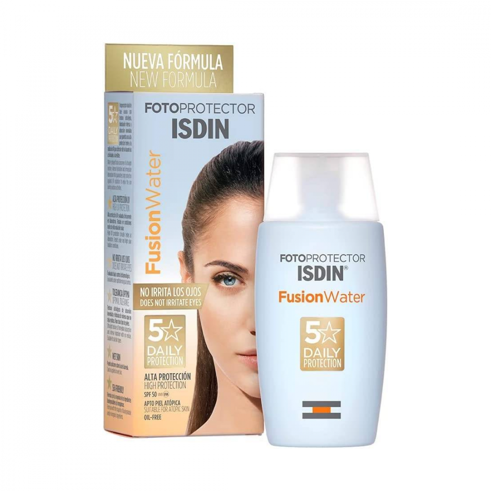 حماية عالية جدًا من أشعة UVB SPF 50+ و UVA. Isdin Fusion Water خفيف الملمس ولا يؤذي العينين.